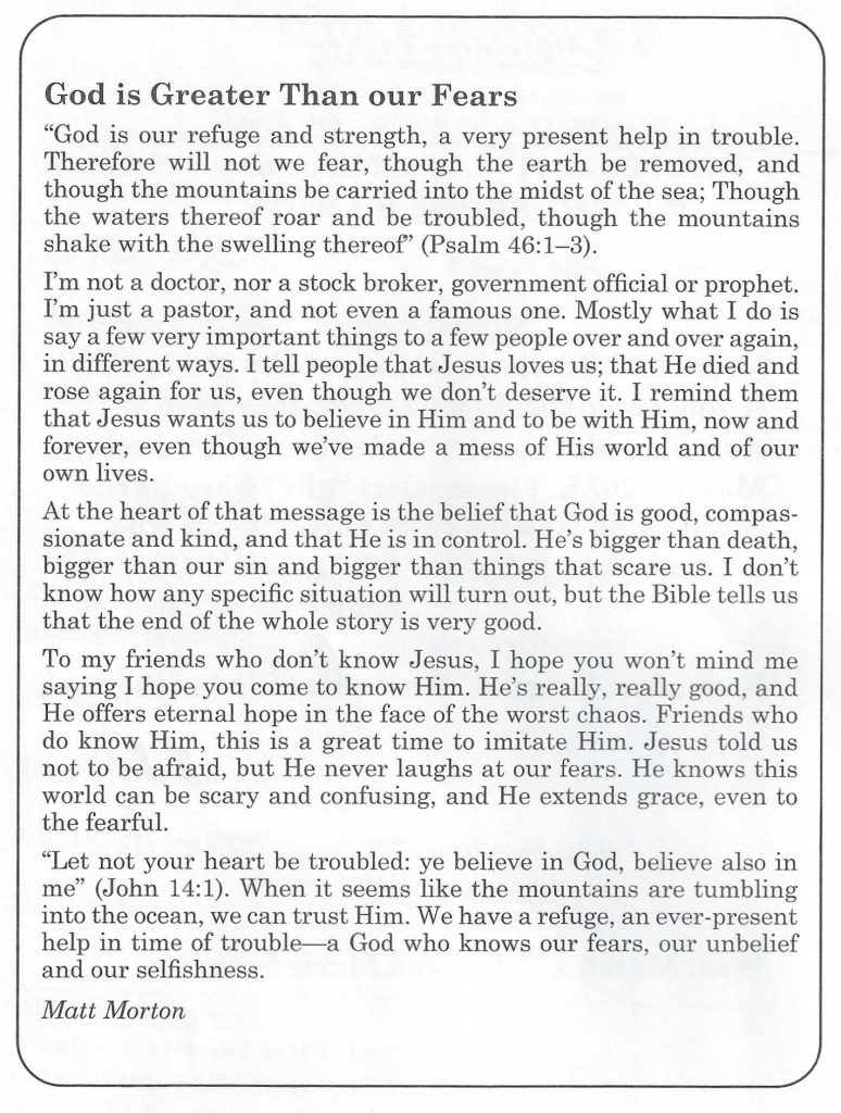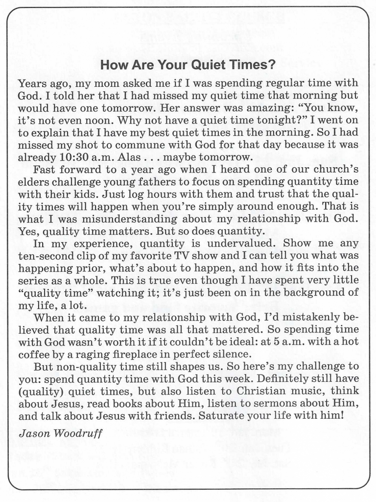 Home: Thoughts from Your Friends at EBC: Bible Study 9:00 am – 10:00 am Every Sunday Sunday School 10:00 am – 11:00 am Main Morning Service 11:00 am – 12:00 pm Thursday Prayer and Bible Study (Currently Suspended) Nursery Provided